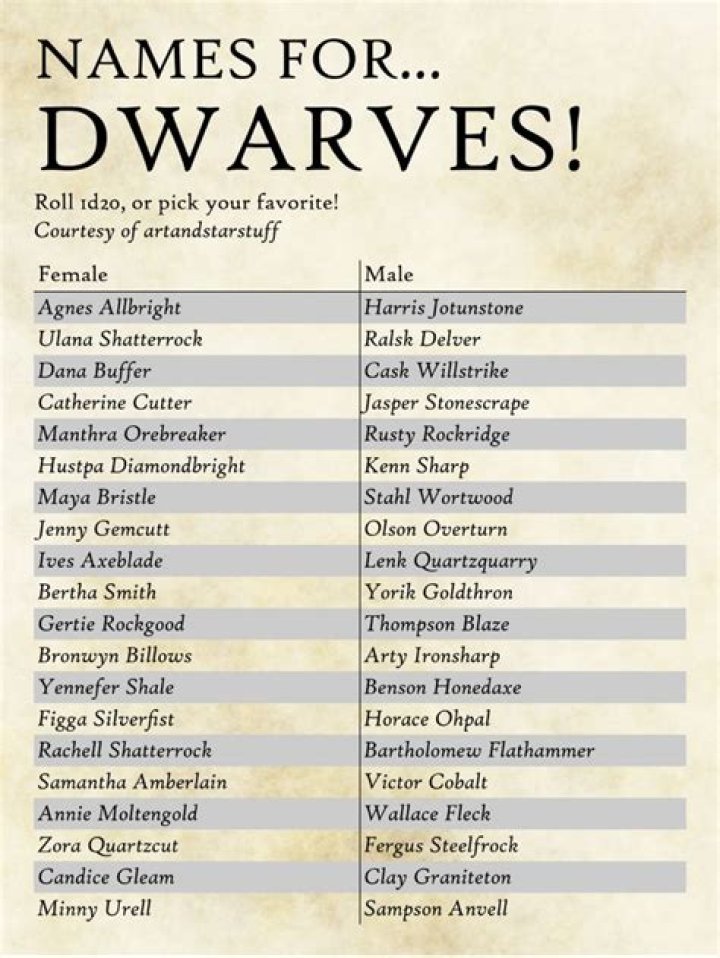 - Historical and Cultural Context: Last names can also convey the historical and cultural context of dwarven characters. A dwarf with the last name "Dragonslayer" hints at a past filled with epic battles, while a name like "Gemfinder" suggests a life dedicated to mining and craftsmanship.